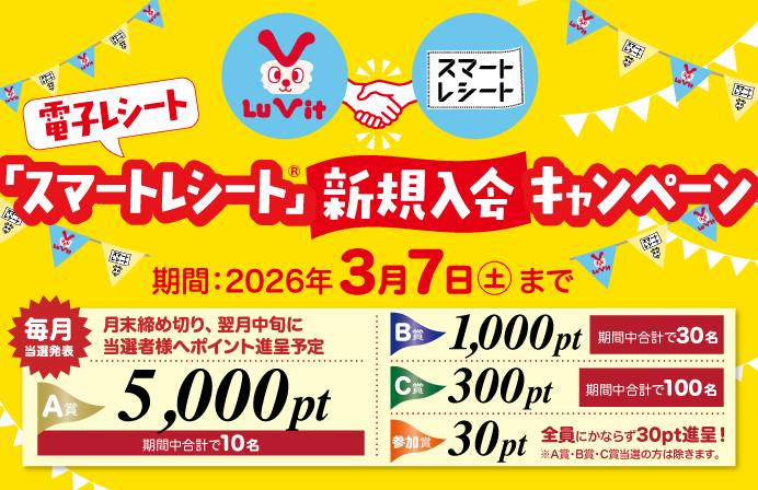 現在は期間限定にて「スマートレシート」を連携いただくだけでルビットポイントが当たるキャンペーンを開催中です。皆様ぜひご参加ください!