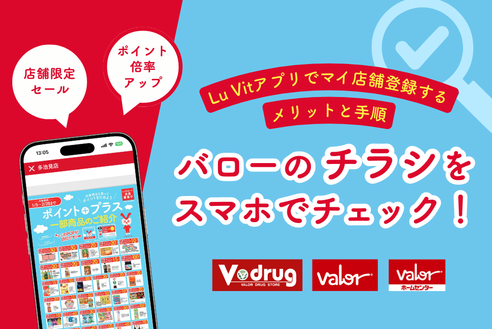 スーパーマーケットバロー、Vドラッグ、ホームセンターバローのチラシ確認は、外部サイトよりもLu Vitアプリを活用するのがおすすめです。アプリなら、複数店舗の情報を一括管理できるだけでなく、マイ店舗登録をすることで検索の手間をなくし、最新のお得情報をいち早く受け取れます。