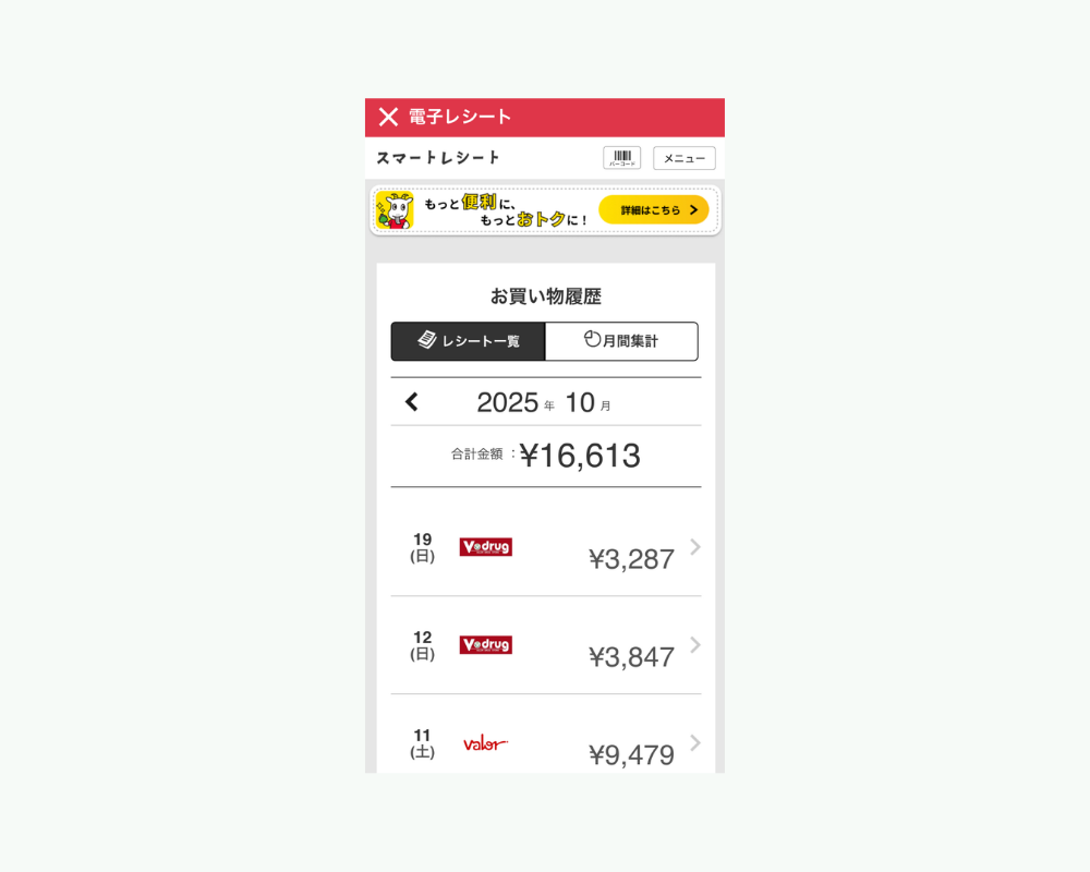 スマートレシート機能を使えば、購入履歴をLu Vitアプリ上で管理できます。紙のレシートを保管する必要がなくなり、家計管理や振り返りもスムーズに。「いつ、何を買ったか」をすぐに確認できる点は、大きなメリットといえるでしょう。