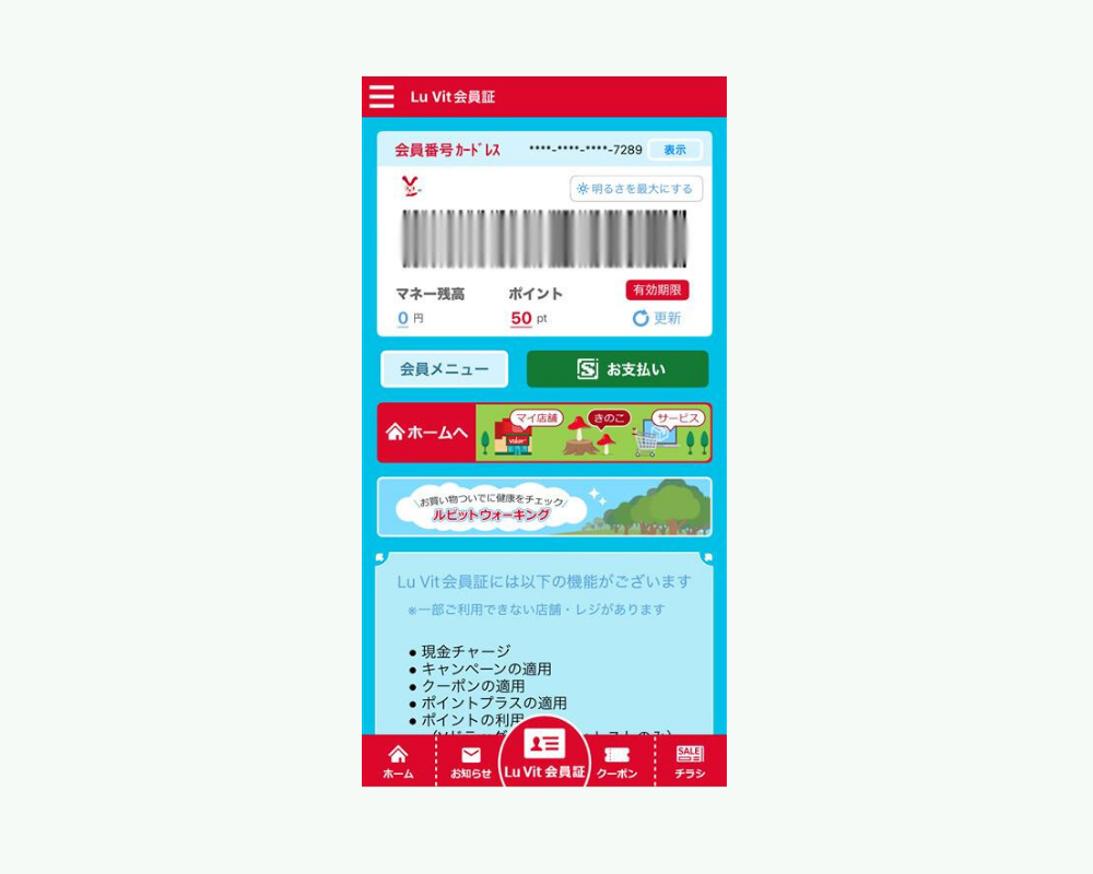 Lu Vitアプリは、デジタル会員証やチラシ閲覧だけにとどまらず、電子マネー「Lu Vit Pay」、歩くだけでポイントが貯まる「ルビットウォーキング」、オンラインで特別な商品を購入できる「ルビットマルシェ」など、知れば知るほど便利でお得な機能がそろったアプリです。