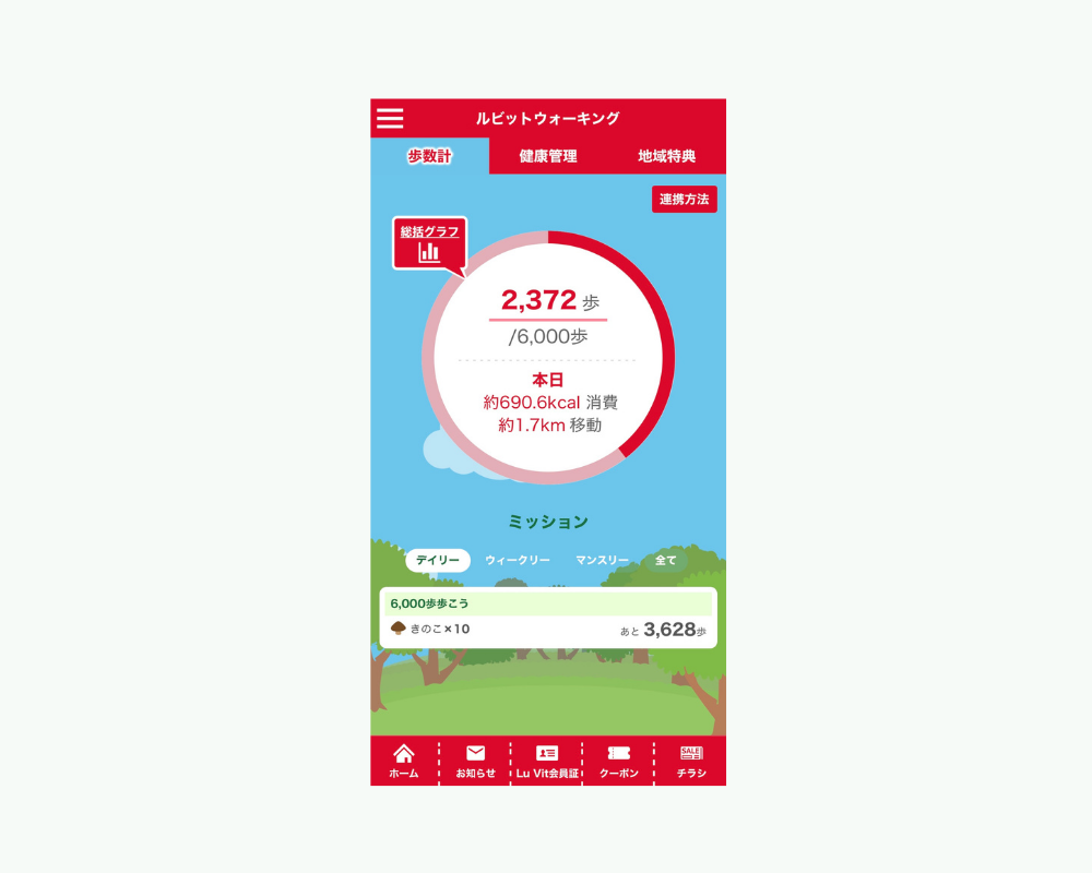 ルビットウォーキングは、日々の歩数を記録する機能です。設定された目標歩数を達成すると、きのこを獲得できます。