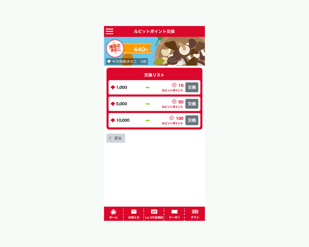Lu Vitアプリには、「きのこ」という独自のポイントシステムがあります。アプリ内でのさまざまなアクションを通じてきのこを集め、一定数に達するとLu Vitポイントに交換可能。マイ店舗登録やアンケート回答、友達紹介など、手軽な操作でも貯められる点が特徴です。
