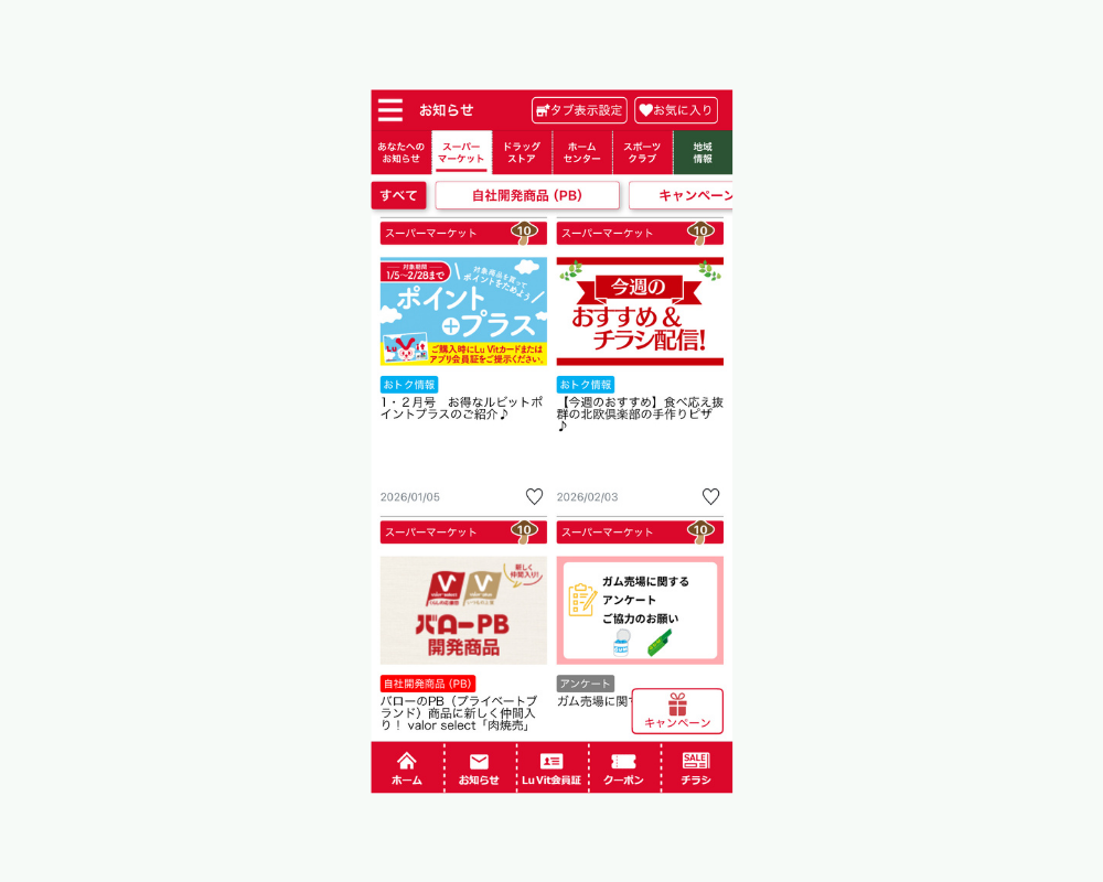 アプリには、バローグループからのお知らせやキャンペーン情報が随時届きます。「お知らせ」タブでは、内容や店舗業態ごとに情報を確認することが可能。通知設定をオンにしておけば、重要なお得情報を見逃しにくくなります。