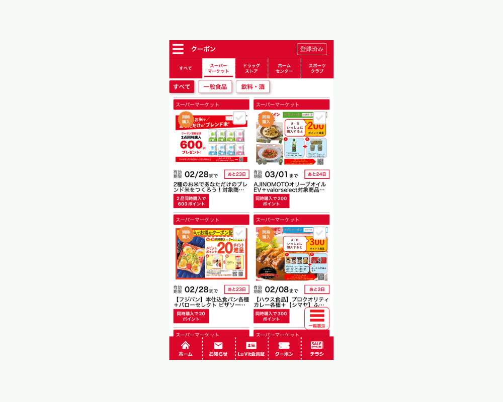 買い物前にチラシを確認する方にとって、デジタルチラシ機能は心強い存在です。Lu Vitアプリなら、紙のチラシを探さなくても、スマホでいつでも最新情報をチェック可能。「マイ店舗登録」をしておけば、よく利用する店舗のチラシやお得情報が自動で表示され、買い忘れ防止にもつながります。