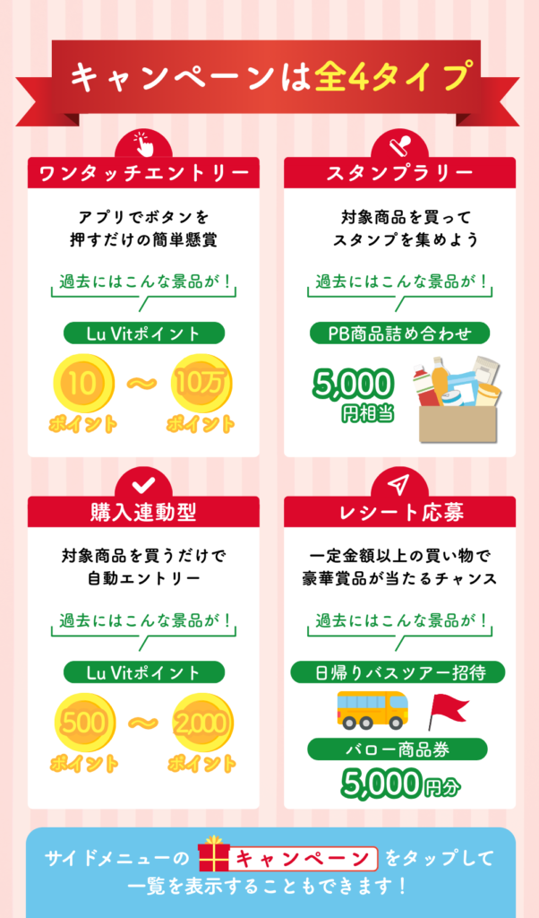 アプリでボタンを押すだけのワンタッチエントリー、対象商品を集めるスタンプラリー、普段の買い物で自動参加できる購入連動型、そして豪華賞品が狙えるレシート応募。どのタイプも、Lu Vitアプリがあれば情報収集から参加までスムーズに行えます。